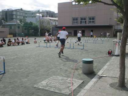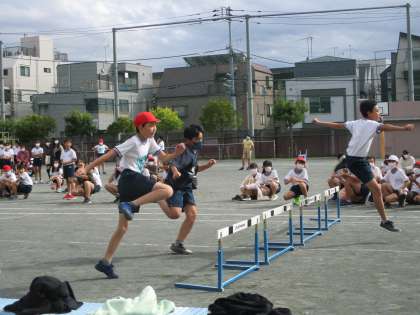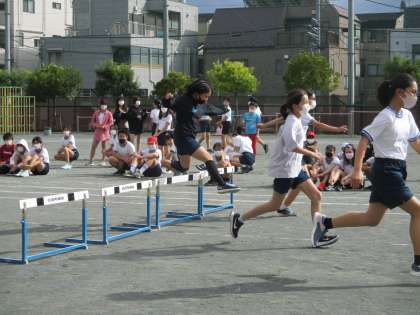 ハードルまでの歩数合わせが難しい中、ほとんどの子がハードルを倒すことなく、軽やかに飛び越し、全力を出して頑張っている姿が印象的でした。