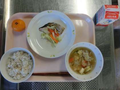 ごまごはん、牛乳、魚の照り焼きソース、豆腐汁、くだもの