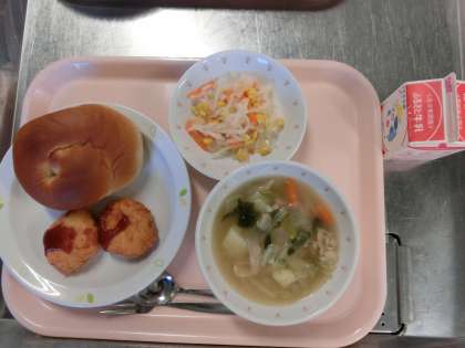 黒砂糖パン、豆腐のナゲット、大根のサラダ、白インゲンの田舎風スープ
