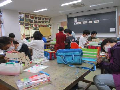 6年生の木工作品が出来上がってきました。細かい形を電動糸鋸で切っている子、絵の具の色付けの工夫をしている子、切り取った板を再利用したデザインを取り入れる子など、ひとりひとりが自分のアイディアを生かして素敵な作品作りを楽しんでいました。