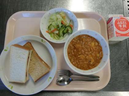 二色サンド、牛乳、トマトシチュー、野菜のレモンサラダ