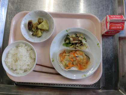 ごはん、魚のみそマヨネーズ焼き、きのこ入りおひたし、さつまいもの甘辛煮