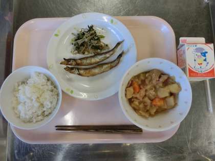 麦ごはん、牛乳、ししゃものカレーあげ、こまつなの乾物あえ、肉じゃがうま煮