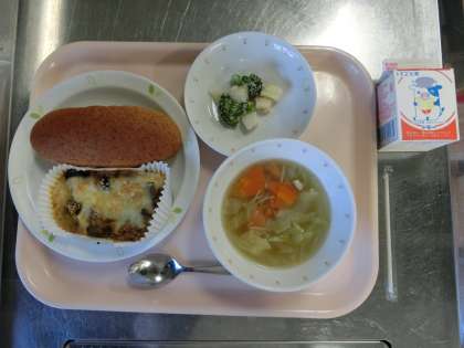 胚芽パン、牛乳、ムサカ、タラモサラダ、野菜スープ