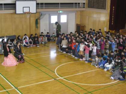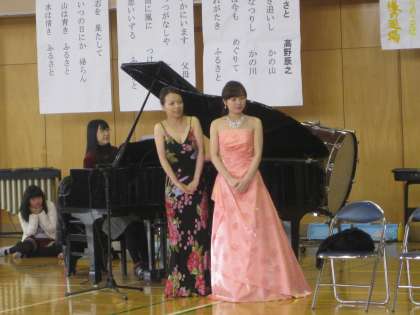 1学期はモンゴルの馬頭琴演奏、2学期はロシアの歌を聴き、異国の文化に触れてきました。3学期は、ソプラノ童謡歌手の土屋朱帆さんとピアニストの本定佳子さんをお招きして、日本で昔から歌い継がれている童謡等の歌を聴きながら、日本の文化を味わいました。