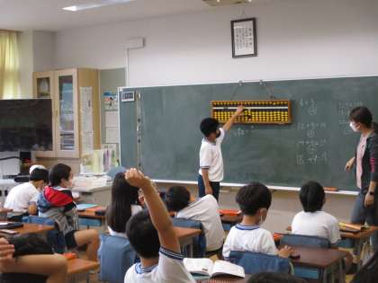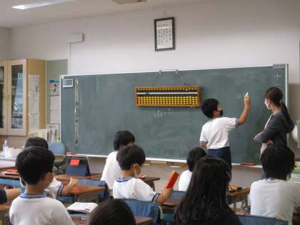 そろばんの学習をしている3年生。親指と人差し指で珠をはじいて数字を表し、たし算の計算をそろばんを使って行っていました。