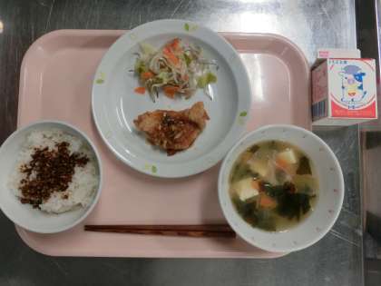麦ごはん、牛乳、ふりかけ、鶏肉の南蛮ソースがけ、やさい炒め、みそ汁
