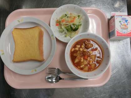 フレンチトースト、牛乳、ポークビーンズ、野菜のドレッシングかけ