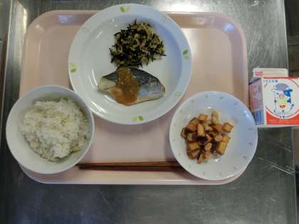 麦ごはん、牛乳、魚のピリ辛ソースかけ、大根とひじきのおかかあえ、お豆かりんとう