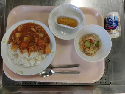 ハッシュドポークライス、はっこう乳、こんにゃくサラダ、スイートパンプキン