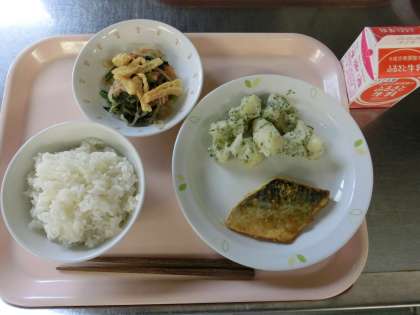 ごはん、牛乳、魚のカレー焼き、粉ふきいも、カリカリ油揚げと野菜のひたし