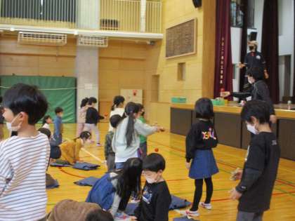 まずは先生がいろいろな技を見せてくれました。子どもたちからはワーッと思わず出る歓声と拍手。そのあとは先生からコツを教えてもらいながら自分たちも練習をしました。