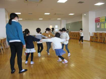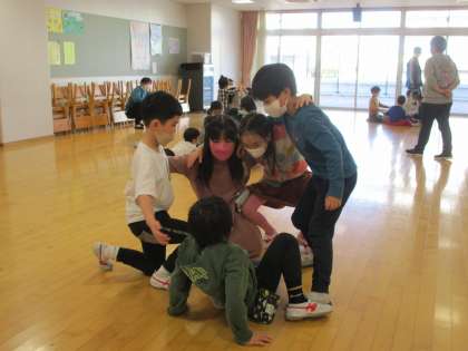 このときのお題は「花」です。しかも、つぼみから花が咲き、種が風に乗って飛んでいくまで、という花の一生がお題に出ていました。どのグループもしっかり話し合いをしながら、よく工夫して考えて全身で表現し、楽しく取り組んでいました。