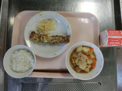 ごはん、牛乳、肉じゃがうま煮、ちくわの磯辺揚げ、大根のレモンしょうゆかけ
