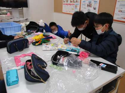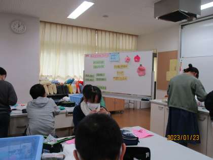 卒業する6年生と新しく入学してくる1年生へ向けて、フエルトの花飾りを5年生が作っていました。
