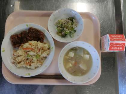 子ぎつねごはん、牛乳、鯨の立田揚げ 野菜のゆかりかけ、豚汁