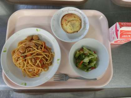 スパゲッティナポリタン、牛乳、野菜のイタリアンドレッシングかけ、りんごマフィン