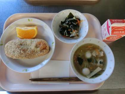 あげパン、牛乳、肉だんご入り春雨スープ、和風サラダ、くだもの