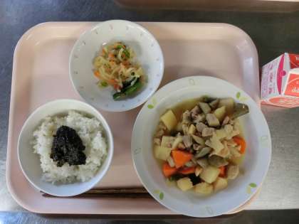 麦ごはん、牛乳、鶏肉とじゃがいものうま煮、大根のサラダ