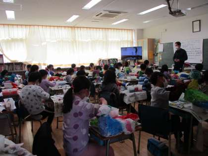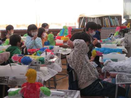2年生の教室では、白い鳥が絵の具でカラフルに塗られて、すてきな鳥へと変身を始めていました。