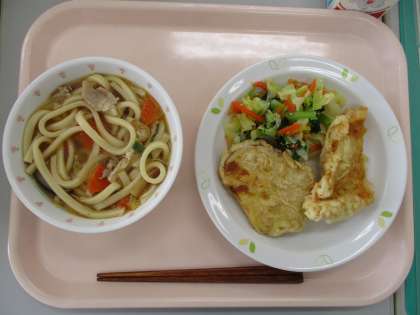 ちゃんこうどん、牛乳、天ぷら(2種)、野菜のごま風味