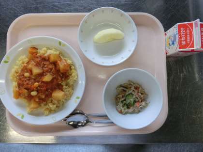 チリビーンズライス、牛乳、もやしとツナのサラダ、くだもの