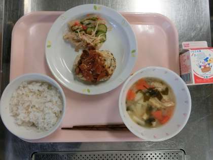 麦ごはん、牛乳、豆腐入りハンバーグ、こんにゃくサラダ、みそ汁
