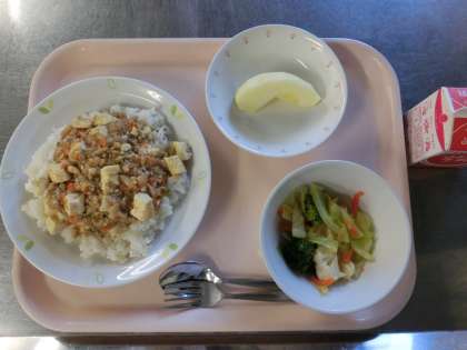 麻婆豆腐丼、牛乳、カリフラワーの中華あえ、くだもの