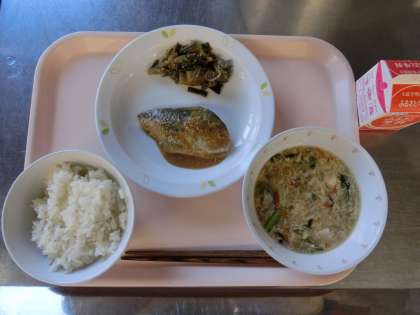 ごはん、牛乳、魚のごまだれかけ、くきわかめの炒め煮、きのこ入りかきたま汁