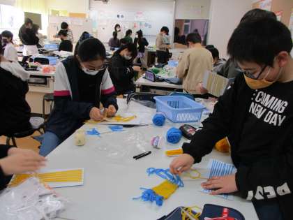 毛糸を、縦糸に横糸を通して織ってみたり、毛糸玉のボンボンを作ったりして、5年生が楽しく小物づくりに取り組んでいました。