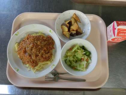 スパゲッティミートソース、牛乳、野菜の甘酢かけ、シナモンポテト