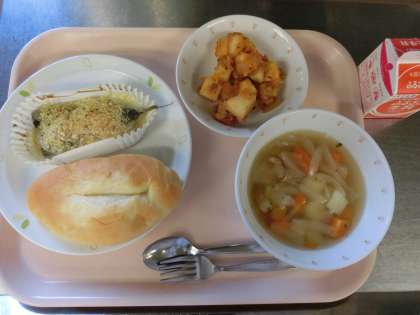 ソフトフランスパン、牛乳、魚のガーリック焼き、じゃがいものケチャップ焼き、野菜スープ