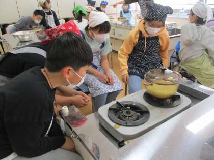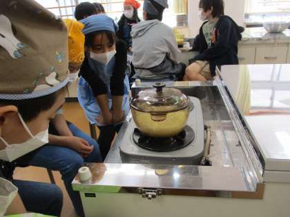 家庭科の調理実習で、5年生がごはんを炊く学習を行っていました。透明の鍋を使っているので、中の様子が良く見えます。