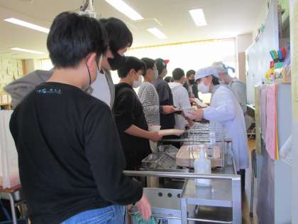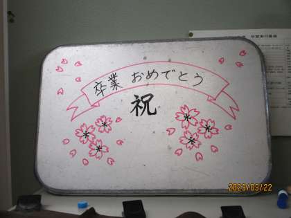 給食の調理員さんがお赤飯の蓋にお祝いメッセージを書いてくれていました。