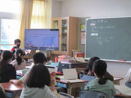 体積を求めるにはどうしたらよいか、その方法を子どもたちが考えて、映し出された図を指しながら、自分の考えをクラスのみんなに発表していました。