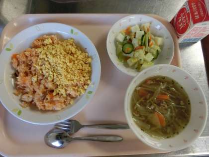 チキンライスたまごぞえ、牛乳、ポテト入りフレンチサラダ、野菜スープ