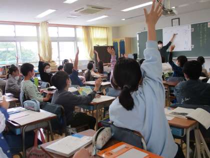 どの子も参加しやすいように教師が「このくらいの気持ちだと思う人は?」と尋ね、自分の考えを挙手で示し、友達の考えと比べていました。