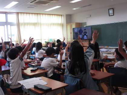 テレビ放送で、先生についての3択クイズ「先生紹介集会」がありました。