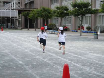 校庭の長い直線コースを一生懸命に走り、タイムを計りました。