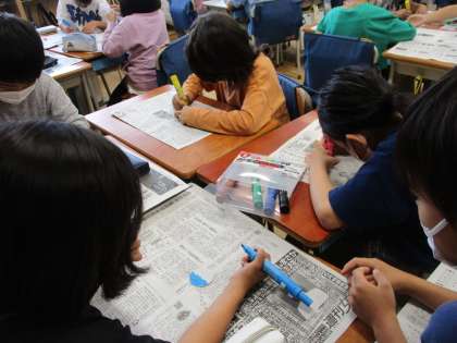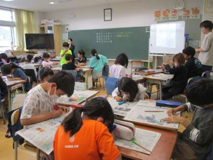 国語の教科書にある「こまを楽しむ」の内容から、3年生が「ぶんぶんごま」を作っていました。回したときに何色になるのか、どんな模様になるのか、ワクワクしながらペンで色を塗っていました。
