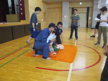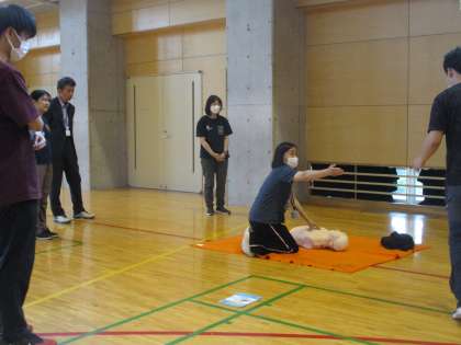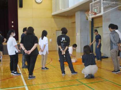 先生たちに向けた救命救急講習会が体育館で行われ、上北沢消防署の方々が講師として来てくださいました。主にAEDの使い方を教えていただきました。