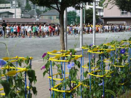 校庭には1年生の育てているアサガオがたくさん咲いていて、真夏がすぐそこまで来ているのが感じられました。