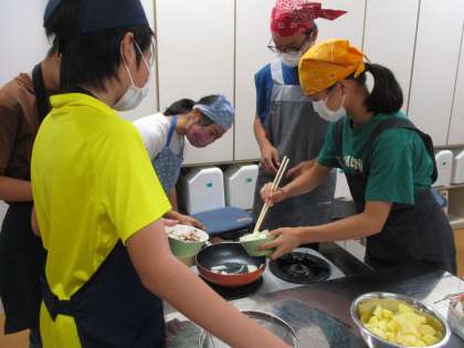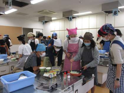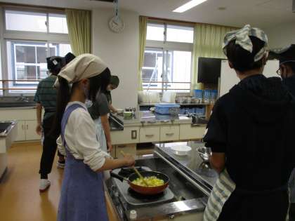 作っているのは、ベーコンポテト(ジャーマンポテト)です。とっても美味しそうないい匂いが、家庭科室中に広がっていました。どの班も、手際よく実習に取り組めていました。