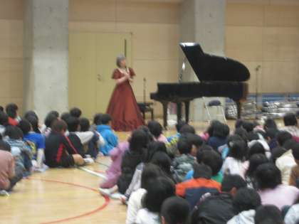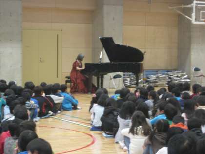 4月14日(土)の2時間目に、ピアニストの高田江里さんをお招きして「落成記念ピアノコンサート」を行いました。高田江里さんは上北沢小の地域にお住まいの方です。お父様の高田三郎氏は、有名な作曲家で、多くの合唱曲をつくられました。高田江里さんは、校舎落成のお祝いコンサートを快く引き受けてくださいました。ベートーベン、ショパン、ドビュッシー、そして、高田三郎氏の曲などたくさんの曲を演奏してくださいました。間近でみる指の動きや演奏者の姿と曲の雰囲気に、子ども達は息をのんで聞き入っていました。体育館にとても美しいすてきな音が響きました。