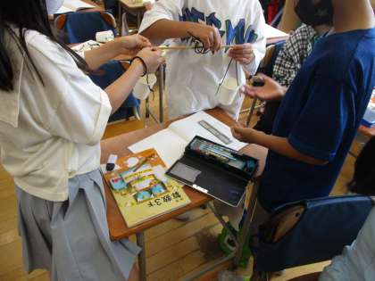 紙コップを使って簡単な天秤を作り、その中に消しゴムを入れて、重さを比べる活動に楽しそうに取り組む3年生。算数の「重さ」の授業です。