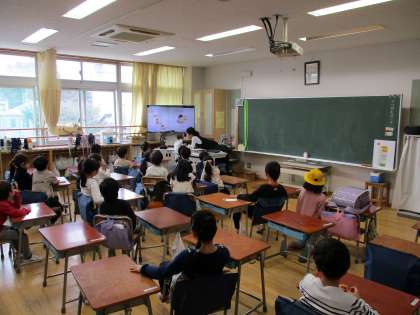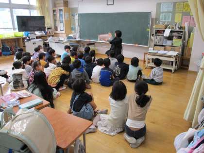 今朝は、1年生と3年生がおはなしたんぽぽの皆さんに読み聞かせをしていただきました。