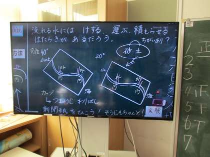 何回か様子を観察した後、水を流す量を変えて違いを見るなど、自分たちで見つけた疑問点を確かめることができました。、