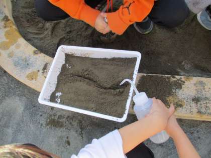 実験用バットに砂を敷き詰めて傾斜をつけ、そこに水を流して砂の変化を観察しました。