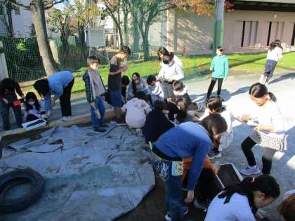 流れる水のはたらきについて、予想を立て、実際に校庭で実験をして確かめました。