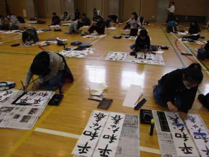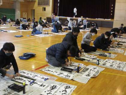 今日と明日は書初め会です。3年生以上の毛筆は体育館、1・2年生は硬筆、教室で行われます。ピンと張り詰めた空気のなか、真剣に文字を書く姿がありました。